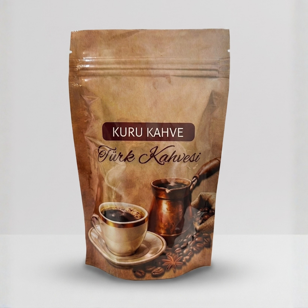 Türk kahvesi tasarımlı doypack ambalajlarımızla ürünlerinizi hem güvenle koruyabilir hem de geleneksel dokuyu modern bir sunumla buluşturabilirsiniz.